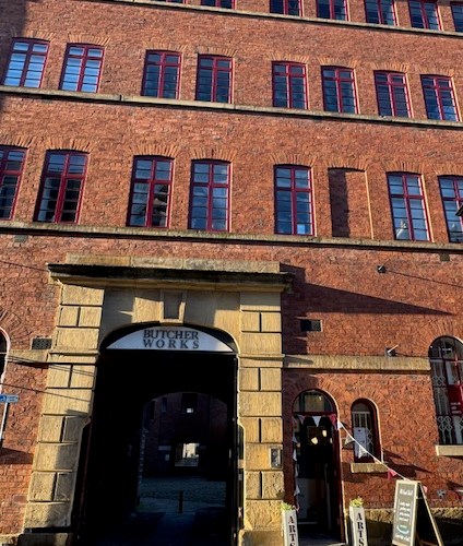 Photo of the Butcher Works, a restored historic cutlery factory on a sunny day with blue sky